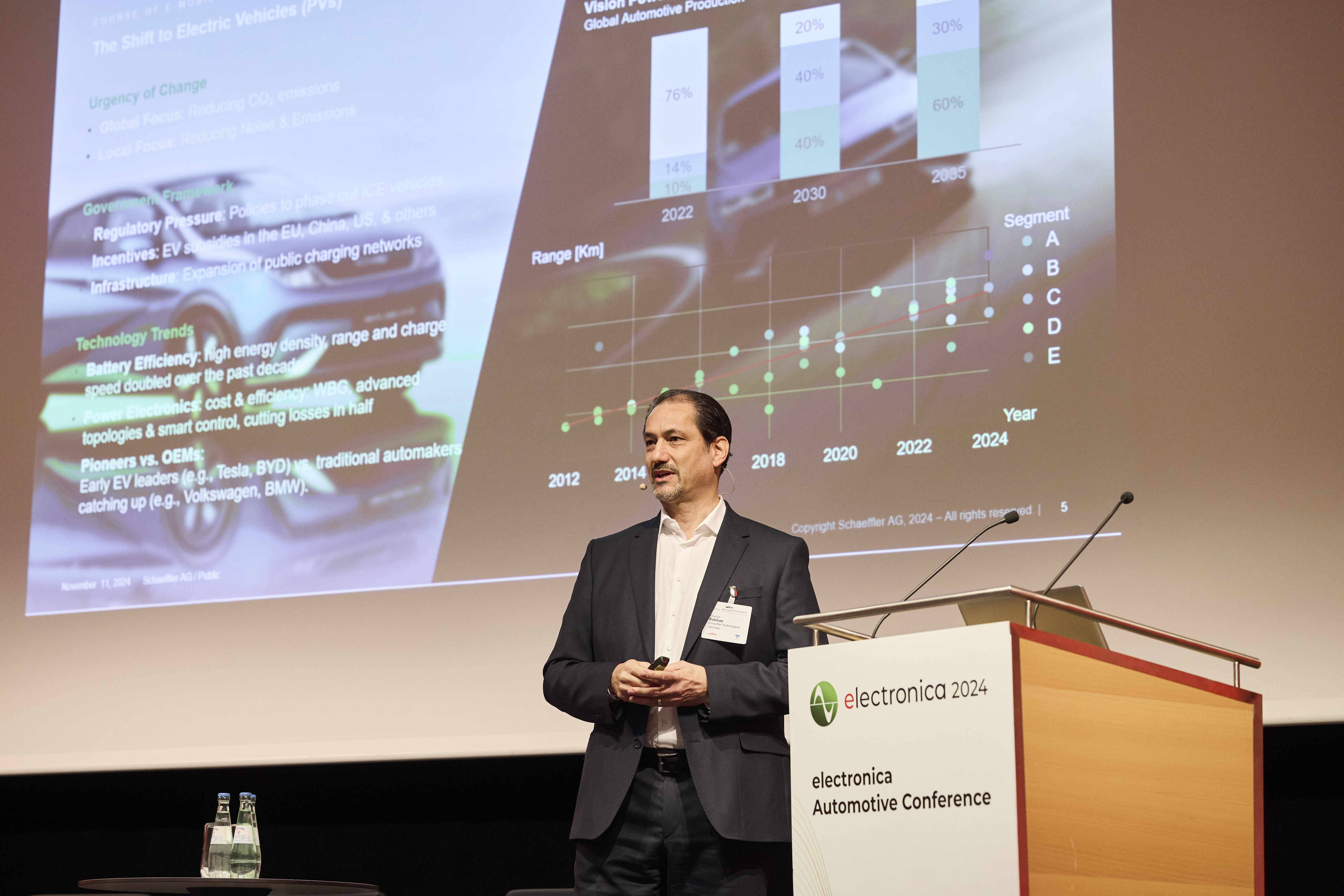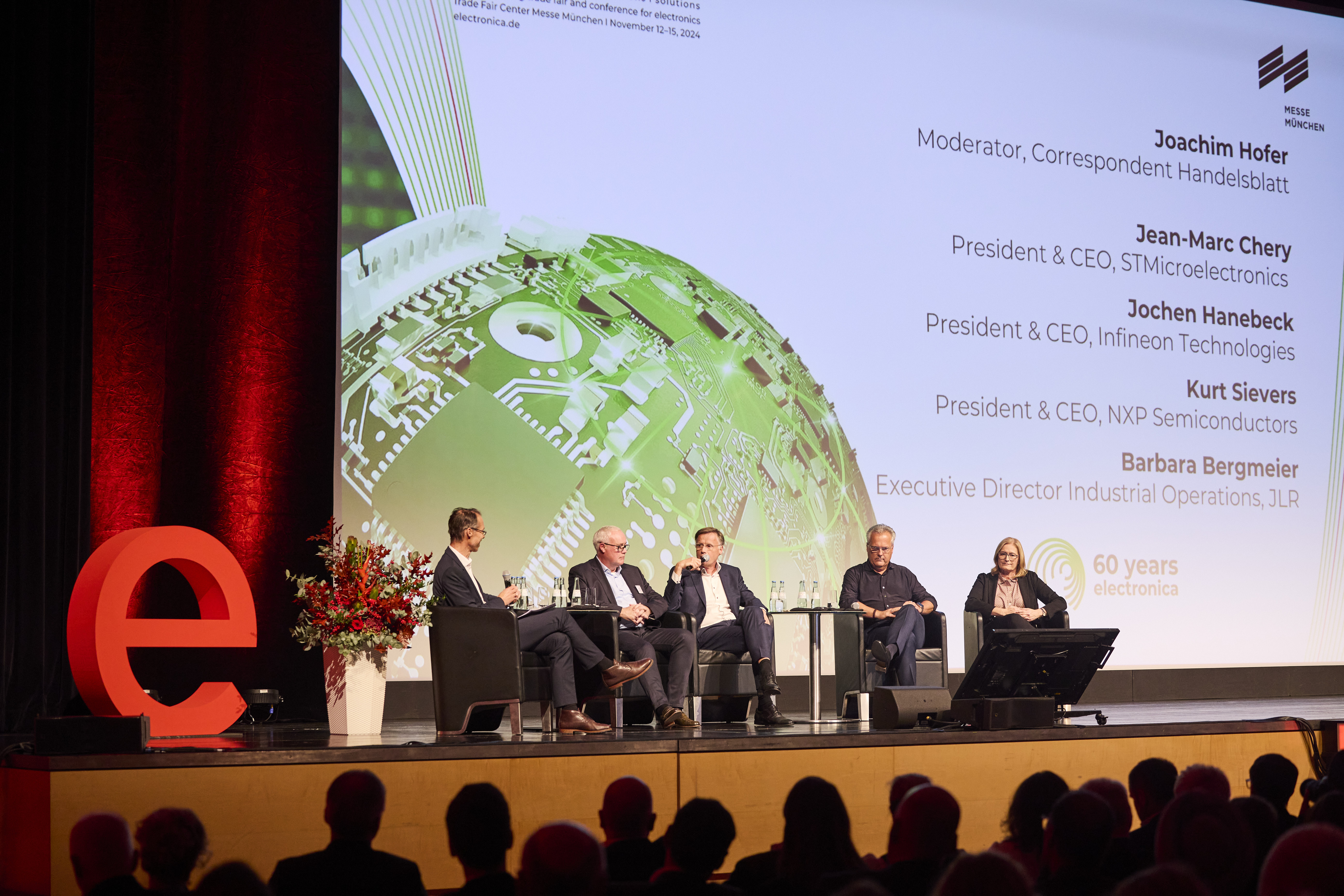 Two program highlights on the day before the trade fair set the stage for a strong start to electronica. The electronica Automotive Conference brought together international specialists and leaders from across the supply chain to discuss the current challenges facing the industry. This was followed in the evening by the renowned CEO Roundtable with CEOs Jean-Marc Chery (STMicroelectronics), Jochen Hanebeck (Infineon Technologies) and Kurt Sievers (NXP Semiconductors) along with special guest Barbara Bergmeier (Executive Director of Industrial Operations at Jaguar Land Rover). Among other things, they highlighted the crucial role of international cooperation in the semiconductor industry and discussed how artificial intelligence can help ensure stable supply chains.